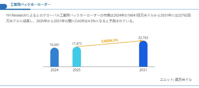 工業用バックホーローダー市場は、用途の汎用性と作業効率の優位性を背景に着実な需要基盤を有しつつ、技術最適化とサービスモデルの転換が進行しています。パワートレインの燃費改善や排出ガス規制対応、油圧制御の精緻化、遠隔診断・テレマティクス導入といった技術的進展が製品競争力の主要要素となりつつあり、同時にレンタルやリースといった利用形態の拡大が市場拡大に寄与しています。市場規模に関しては、世界市場は2024年に16,641百万米ドルの規模と評価され、2031年には22,762百万米ドルへ拡大する見込みであり、2025年から2031年の期間における年平均成長率は4.5%と算出されています。 この中位成長率は、成熟市場での新規需要と機械更新のバランス、並びにレンタル市場やサービス収益へのシフトが同時に進む構図を反映しています。供給側では部品調達と生産効率、アフターサービス網の構築が収益性の分かれ目となり、需要側ではインフラ投資の波動、公共投資の優先度、現場の省人化ニーズが発注動機として重要です。総じて、本セグメントは堅実な成長が見込まれる一方で、燃費・排ガス対応、遠隔保守といった技術適応力と、販売からサービスへと収益構造を転換する事業力が企業価値を左右すると考えられます。