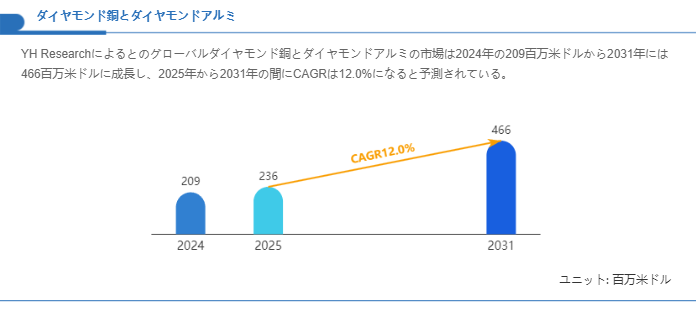 市場規模の推計では、世界のダイヤモンド銅・ダイヤモンドアルミ市場は2024年に209百万米ドルの規模にあり、2031年には466百万米ドルへと拡大する見込みです。期間中の成長動向を年率換算すると、2025年から2031年にかけて年平均成長率は12.0%と算定されており、短中期的に高い成長ペースが予想されます。この伸長は高性能放熱材料に対する需要増と、電子機器の高密度実装化に伴う放熱要求の増大が直接的な背景要因となっています。