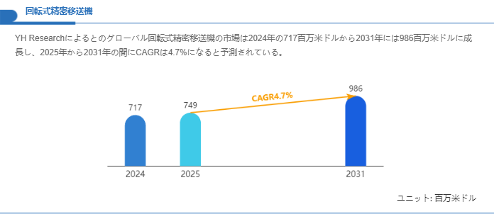 回転式精密移送機の市場は、精密製造分野における自動化ニーズと微細化トレンドの影響を受けて堅調に推移しています。提供された市場推計に基づくと、世界市場は2024年におおむね717百万米ドルの規模にあり、今後の用途拡大と設備更新を通じて2031年には986百万米ドル規模へと成長するレンジに位置付けられます。これを年率換算すると、2025年から2031年にかけて年平均約4.7%で拡大する計算になり、中長期的に安定した成長基調が想定されます。市場拡大の背景には、半導体・電子機器分野の生産ラインでの歩留まり改善要求、ファクトリーオートメーションの高度化、および医療・光学分野での高付加価値製品の量産化が挙げられます。
