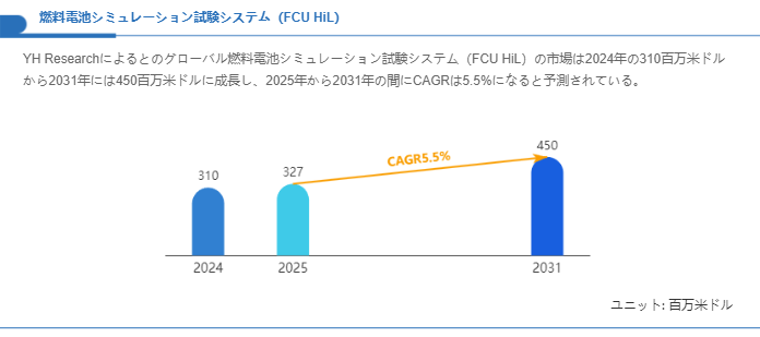 燃料電池シミュレーション試験システム(FCU HiL)の市場は、燃料電池車(FCV)や定置用燃料電池システムの開発拡大、および車載・発電用電力制御の高度化ニーズに伴って拡大基調にあると評価できます。既存の市場推計を踏まえると、2024年のグローバル市場規模は3.10億米ドル程度の水準に位置しており、今後の技術投資と検証需要の増加を背景に、2031年には4.50億米ドル前後まで拡大する見通しとなっています。このレンジは、2025年から2031年にかけて年平均約5.5%の成長率に相当し、中期的に安定した拡大過程が続くことを示唆しています。