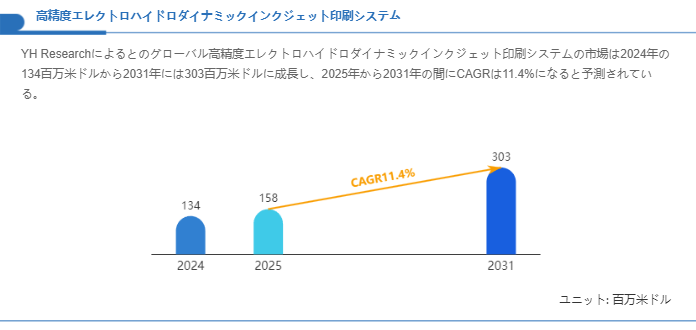 市場規模と成長見通しに関しては、既存の業界調査に基づく試算が示すとおり、当該市場は短期〜中期で着実な拡大が見込まれます。YH Researchによる推計では、本市場は2024年に134百万米ドル規模に位置付けられており、今後の技術成熟と用途拡大を受けて2031年には303百万米ドル程度にまで拡大すると見込まれています。これを年率で表すと、2025年から2031年にかけて年平均成長率(CAGR)は約11.4%に達するとの見通しが提示されています。市場拡大の原動力は、高解像度・高付加価値部品への需要増、機能性インクの普及、及び従来プロセスでは実現困難だった微細パターニングのニーズの顕在化にあります。