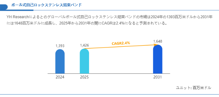 2020年~2025年の実績データと、2026年~2031年の将来予測に基づいて、ボール式自己ロックステンレス結束バンド市場の規模、成長率、構造変化を定量的に評価します。中長期的な戦略立案・投資判断の基盤となる分析結果を提供します。
