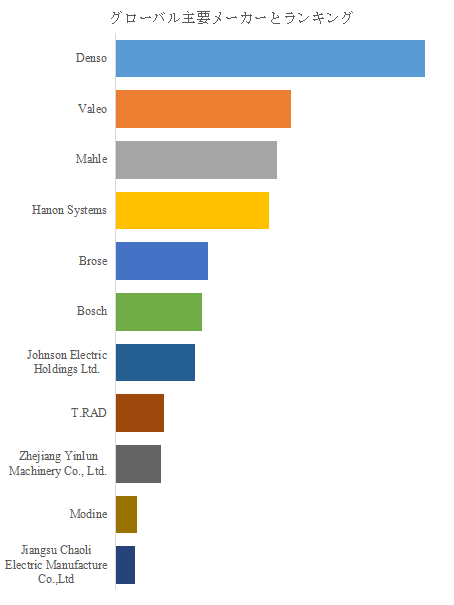 競争構造を見ると、Densoが市場を牽引する地位を確立している。トヨタグループを中心に高信頼性の冷却技術を蓄積し、電動化対応型熱マネジメントの分野でも先行している。次点にはフランスのValeo、ドイツのMahleが続き、欧州勢はエネルギー効率とコンパクト設計を軸にシェア拡大を図っている。韓国のHanon Systems、ドイツのBrose、BoschなどもEV向け統合冷却システムで存在感を強めている。日本勢ではDensoのほか、T.RADが軽量放熱技術と高耐腐食性材料で特長を持ち、中国市場や北米市場に展開を広げている。一方、中国ではZhejiang Yinlun MachineryやJiangsu Chaoli Electric Manufactureが国産EVメーカーとの協業を通じて急成長を遂げつつあり、地域間競争が激しさを増している。