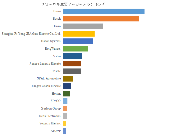 本市場を支える主要メーカーには、Brose、Bosch、Denso、Shanghai Ri Yong-JEA Gate Electric、Hanon Systems、BorgWarner、Valeo、Jiangsu Langxin Electric、Mahle、SPAL Automotiveなどが挙げられる。2024年時点で、世界トップ5社が売上ベースで約50%のシェアを占めており、高い寡占性を維持している。欧州勢ではBoschとValeoが技術統合型モジュールで優位を築き、日系のDensoとMahleは信頼性と量産技術でグローバルOEMとの強固な関係を保っている。中国勢のJEA Gate ElectricやLangxin Electricはコスト競争力と電動化対応力を武器に急速な成長を遂げており、地域間競争は激化の一途をたどっている。また、Hanon SystemsやBroseなどは冷却ファンを熱マネジメント全体の一部として位置づけ、HVACやバッテリー冷却との統合ソリューションを展開している点が特徴である。このようなプレイヤー間の戦略的提携や技術共創が市場構造をより動的なものにしている。