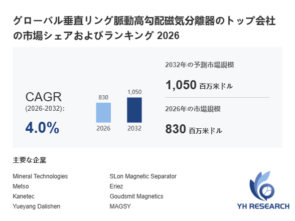 YHResearch調査チームの最新レポート「グローバル垂直リング脈動高勾配磁気分離器のトップ会社の市場シェアおよびランキング 2026」によると、2026年の830百万米ドルから2032年には1050百万米ドルに成長し、2026年から2032年の間にCAGRは4.0%になると予測されています。