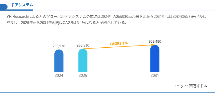 ドアシステム市場は建設投資や既存建築の改修需要、ならびにエネルギー効率・安全基準の強化を背景に安定的な拡大を見せています。提供された推計値を踏まえますと、グローバル市場規模は2024年時点で255,930百万米ドルに達しており、2025年から2031年の期間に年平均成長率が3.1%で推移するという前提に基づくと、2031年には308,480百万米ドル程度の規模になる見込みです。この成長率は極めて急速な拡大を示すものではないものの、市場が成熟段階に入りつつあるなかでも、製品の高機能化やサービス化を通じて付加価値が増大する構造を反映しています。
