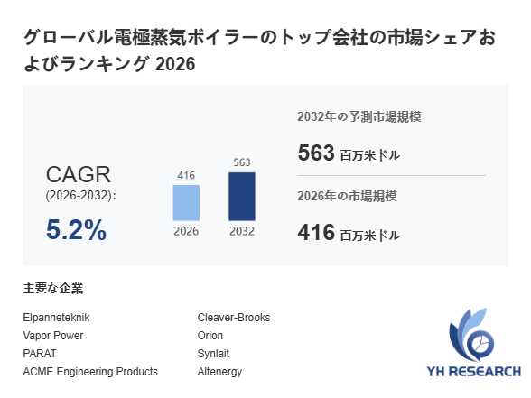 YHResearch調査チームの最新レポート「グローバル電極蒸気ボイラーのトップ会社の市場シェアおよびランキング 2026」によると、2026年の416百万米ドルから2032年には563百万米ドルに成長し、2026年から2032年の間にCAGRは5.2%になると予測されています。