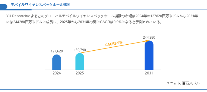 モバイルワイヤレスバックホール機器市場は、モバイルデータトラフィックの持続的増加とネットワークの高密度化により需要が拡大している分野です。基準年の2024年における市場規模は127,620百万米ドルに相当すると評価され、将来の見通しでは2031年に244,280百万米ドルへと拡大する予測が示されています。これを勘案すると、2025年から2031年の年平均成長率(CAGR)は約9.9%に達する計算となり、短中期的に高い成長テンポが想定されます。こうした成長は、都市部のセル密度向上や屋内外での帯域需要増、産業用途での無線化推進といった複数の需要側要因が同時に作用していることを示唆しています。