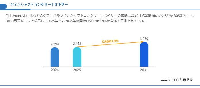 市場のマクロな動向を整理すると、ツインシャフトコンクリートミキサーは大型インフラやプレキャスト市場の需要伸長を受け、安定した成長軌道を描く見通しです。与えられた市場推計を基にすると、2024年の世界市場規模は約23億9,400万米ドルに相当し、2031年には約30億6,000万米ドルにまで拡大すると想定される。これらの水準は、2025年から2031年にかけて年平均で約3.9%の成長率を示す計算となり、中長期のインフラ投資やプレキャスト生産の恒常需要によって支えられる緩やかな拡大を示しています。成長率は極めて急速ではないものの、市場のベースラインが大きいことから、累積的な市場増分は設備メーカーと部品・サービス提供者にとって有意な市場機会を提供します。