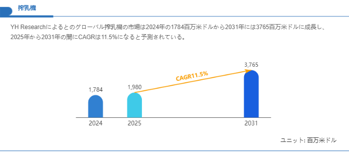 YH Researchの調査では、2025年から2031年にかけて、搾乳機の世界市場は年平均成長率(CAGR)11.5%で拡大を続けると予測されています。2024年には約1784百万米ドルだった市場規模は、2025年には1980百万米ドルに達し、2031年には3765百万米ドル規模に成長する見込みです。この成長は、技術革新や需要の高まり、産業構造の変化といった要因に後押しされています。