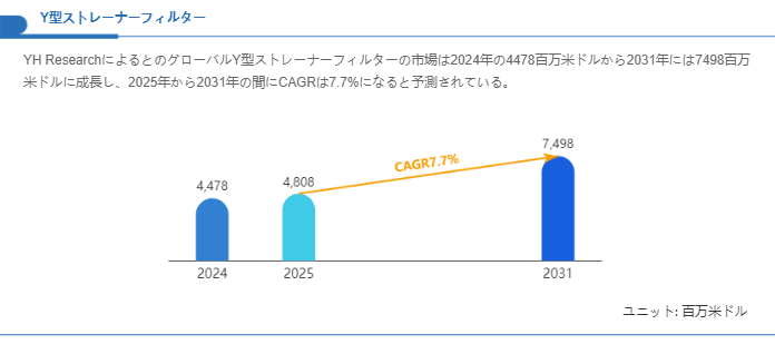 市場規模の観点では、直近の評価でグローバルY型ストレーナーフィルター市場は2024年に4,478百万米ドル規模と見積もられており、2031年には7,498百万米ドルへと拡大する見込みが提示されています。対象期間の中心となる2025年から2031年における年平均成長率は7.7%と算定されており、これは関連する産業インフラ投資や既設設備の更新、及び流体処理需要の拡大に伴って比較的高い成長軌道が想定されていることを示しています。市場拡大は単純な数量増だけでなく、材質・構造・メンテナンス性を高めた高付加価値製品の導入や、複雑化するプロセス要件への適合を通じて進行すると見られます。