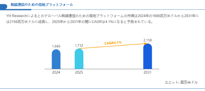 経済面の見通しについては、YH Researchの推計を踏まえると、市場規模は2024年に約16億6,600万米ドル(1,666百万米ドル)と評価されており、その後も需要は拡大を続け、2031年には約21億5,800万米ドル(2,158百万米ドル)にまで成長すると見込まれています。これにより、2025年から2031年における年平均成長率(CAGR)は約4.1%となる計算であり、中期的には穏健ながら確実な拡大軌道が想定されます。成長を支える主要因は、通信インフラの補完ニーズ、IoTおよびM2M通信の拡大、災害対策や緊急展開ニーズの顕在化、そして一部地域における衛星通信コストの課題を補うという経済合理性です。一方で市場の拡大を制約し得る要素としては、空域および周波数の規制調整の難航、プラットフォーム製造と運用に係る資本コスト、長期滞空運用に対する信頼性確保と保守体制の構築が挙げられます。