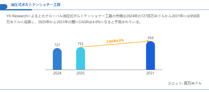 市場規模の観点では、提供いただいた統計値に基づくと、世界の当該市場は2024年に7億2700万米ドルの規模にあり、2031年には9億5800万米ドルへと拡大する見込みです。この期間における年平均成長率(CAGR)は、2025年から2031年の間で4.0%と算出されており、装置需要は着実な成長軌道を描くと評価できます。成長を支える背景要因としては、大型インフラプロジェクトや既存プラントの改修、発電所や石油・ガス設備における保守・更新作業の継続的な需要、ならびに工事品質管理基準の厳格化に伴う高精度締結技術の採用増加が挙げられます。数値面では、2024年から2031年への拡大は総額で約2億3100万米ドルの増加を示し、専門装置としての堅調な市場拡大を示唆しています。