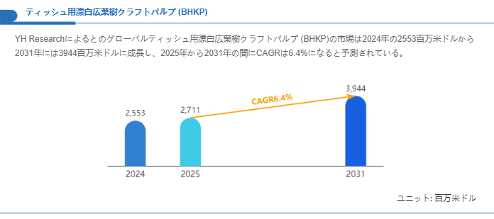 市場規模の見通しを整理すると、基準年である2024年におけるティッシュ用BHKPのグローバル市場は2,553百万米ドルと評価され、2031年には3,944百万米ドルへと拡大する想定が示されています。この数値に基づくと、2025年から2031年にかけての年平均成長率は6.4%に相当する成長軌跡が描かれます。こうした中期的な拡大は、製品の付加価値化傾向(よりソフトで高吸収のティッシュ製品への需要)と、衛生・快適性を重視する消費者ニーズの持続に支えられていると評価できます。ティッシュ用途は消耗品であり、品質差別化がブランド価値に直結するため、高品質パルプへの継続的な投資余地が市場の成長要因となります。