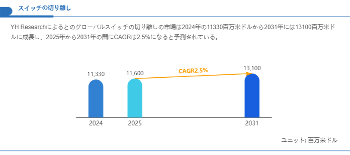 スイッチの切り離し市場は電力インフラの維持・更新需要、産業プラントの安全基準強化、及び分散型電源や再生可能エネルギーの導入拡大を背景に安定的な需要基盤を保持しています。基礎データとしては、2024年の世界市場規模が11,330百万米ドルに位置しており、この基点をもとに2025年から2031年の年平均成長率を2.5%と仮定すると、2031年には市場規模が13,100百万米ドル程度に達する見通しとなります。この緩やかな成長率は市場の成熟度を反映しているものの、既存設備の更新需要と安全基準強化による置換需要が持続的な需要を支える要因となっています。