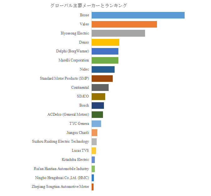 自動車用 HVAC ブロワー モーターの世界市場において、主要製造業者としては、Brose、Valeo、Hyoseong Electric、Denso、Delphi (BorgWarner)、Marelli Corporation、Standard Motor Products (SMP)、Nidec、Continental、SIMCO といった企業が挙げられる。これらの企業は、ブラシ付き/ブラシレス両モーターにおいて広く製品ラインを揃えており、世界的な自動車メーカー(OEM)への供給実績を持つ。さらに、2024年時点で上位10社がグローバル市場の約 60% の売上シェアを占めていたとの報告もある。市場構造としては、こうしたグローバル Tier-1 企業が主導する寡占市場である一方、小規模/地域専業サプライヤーも存在し、特にアフターマーケットや地域向け商用車向けに競争が分散している。この構造は、コスト競争力と同時に、技術力や品質、供給体制の信頼性を評価する顧客側ニーズの高さを反映している。