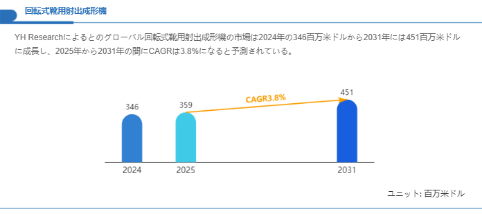 市場規模に関しては、YH Researchの推計を踏まえると、本市場の世界規模は2024年に346百万米ドル相当であり、2031年には451百万米ドルに達する見通しです。対象期間の中心となる2025年から2031年にかけては年平均成長率が約3.8%と算定されており、この成長は主として設備の段階的更新需要とグローバルなフットウェア生産能力の安定的拡大に支えられる構造を示しています。短期的な需要の急騰ではなく、長期的な生産投資サイクルに沿った着実な拡大プロファイルが観察されます。