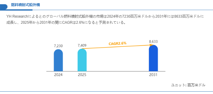 市場規模の観点から整理すると、世界の燃料噴射式船外機に関する市場は2024年に7,230百万米ドルを計上しており、今後拡大が見込まれて2031年には8,633百万米ドルに達すると見込まれています。これを基に算出した2025年から2031年の年平均成長率は2.6%となり、成熟した市場における着実な成長シナリオが示されています。こうした緩やかな成長は、レジャー活動の一定の回復基調と既存艇の更新需要、ならびに排出ガス規制への対応として燃料噴射化への置換が継続している構造的要因を反映しています。燃料噴射式の導入は単に燃費改善をもたらすだけでなく、燃焼の精密制御による排出物低減や点検周期の最適化など運用コスト面での優位性を提供するため、性能と環境対応を両立させたい顧客層に支持されています。