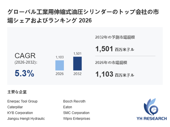 YHResearch調査チームの最新レポート「グローバル工業用伸縮式油圧シリンダーのトップ会社の市場シェアおよびランキング 2026」によると、2026年の1103百万米ドルから2032年には1501百万米ドルに成長し、2026年から2032年の間にCAGRは5.3%になると予測されています。