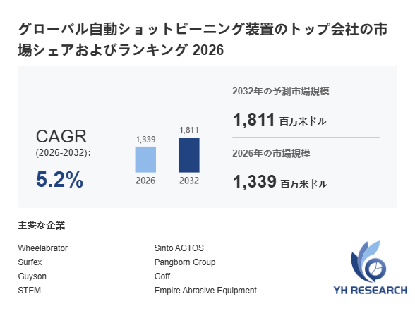 YHResearch調査チームの最新レポート「グローバル自動ショットピーニング装置のトップ会社の市場シェアおよびランキング 2026」によると、2026年の1339百万米ドルから2032年には1811百万米ドルに成長し、2026年から2032年の間にCAGRは5.2%になると予測されています。