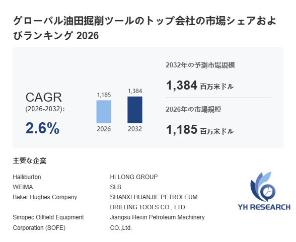 YHResearch調査チームの最新レポート「グローバル油田掘削ツールのトップ会社の市場シェアおよびランキング 2026」によると、2026年の1185百万米ドルから2032年には1384百万米ドルに成長し、2026年から2032年の間にCAGRは2.6%になると予測されています。