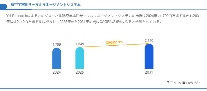 航空宇宙用サーマルマネージメント市場は、航空機の電化(電動推進・高出力電子機器の搭載増加)、地上発射・宇宙ミッションの多様化、衛星コンステレーションや小型衛星の急増といった構造的需要拡大の影響を受けています。提供された市場推定に基づくと、2024年の世界市場規模は1,799百万米ドルであり、2031年には2,140百万米ドルへと成長する見込みで、2025年から2031年にかけての年間平均成長率は約2.9%と算定されています。これらの数値は、市場が急伸する段階ではないものの、技術刷新と用途拡大を通じた着実な拡大基調にあることを示しています。