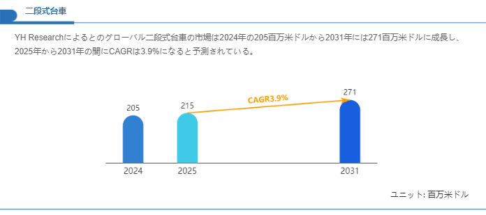 二段式台車を製品カテゴリ別に分類し、販売量、平均価格、売上、CAGRの推移、競争状況を包括的に解説します。