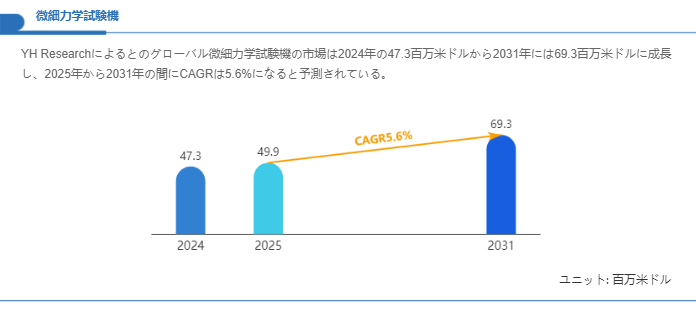 市場規模に関する指標を整理すると、世界の微細力学試験機市場は2024年に47.3百万米ドルの水準にあり、2031年には69.3百万米ドルに達する見込みで、2025年から2031年の期間における年平均成長率は5.6%と見積もられています。この成長見通しは、先端材料やナノデバイス、微細加工技術の研究開発投資が継続していること、並びに半導体・MEMS産業やバイオメディカル分野で微小機械特性の精密評価需要が増加している構造的な需要背景を反映しています。特に微細構造体の信頼性評価や薄膜の機械的挙動解析は、製品性能の向上と歩留まり改善に直結するため、研究機関のみならず製造プロセス側でも装置導入の重要性が高まっています。