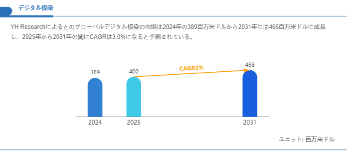 デジタル捺染は版を用いない可変印刷の特性を活かし、多品種少量、短納期、デザイン多様化という現代の需要構造に整合する技術プラットフォームです。提示された市場推計は、2024年の389百万米ドルを起点に、年率約3.0%で成長し2031年に466百万米ドル規模へ拡大すると見込まれることを示しており、技術的成熟と用途拡大が着実に市場を押し上げる構図がうかがえます。総じて、品質管理の高度化と工程の最適化が普及拡大の鍵であり、製品ミックスの高度化を通じた付加価値創出が収益性を左右する重要要素となる見通しです。