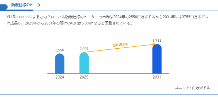 市場動向と技術的特徴を整理します。近年は産業安全規制の強化と施設信頼性向上の要請を背景に、防爆ヒーターの需要が着実に拡大しています。装置側のトレンドとしては、耐久性を維持しつつ小型化・高効率化を図る設計、制御部の高度化による温度精度改善、および保守性を高めるモジュール化が進んでいます。加えて、プラント側の安全管理強化や老朽設備の更新需要、エネルギー効率改善要求が導入機会を押し上げる要因になっています。一方で、製品は高い安全要求と認証手続き、そして現場ごとの仕様対応が必要なため、製造コストと納期・技術サポート体制が供給サイドの競争力を左右します。経済的展望については、YH Researchの推計を基にすると、グローバル市場は2024年に約25億5,000万米ドルの規模を有しており、今後も拡大を続け、2031年には約37億5,500万米ドルにまで到達する見込みです(2025〜2031年の年平均成長率は約6.0%)。この成長は、規制遵守を前提とした更新需要、危険現場向け設備の新設・増設、ならびにより厳格な運用管理を求める業界慣行の浸透によって支えられると考えられます。供給側では、品質保証体制と認証対応力、アフターサービス網、ならびに製品差別化(耐久性・省エネ性能・保守性)が市場シェアに直結する主要因です。リスク要因としては、原材料価格の変動、規制改定に伴う適合コスト、ならびに現場での保守技術者不足が挙げられ、これらは採算性と導入スピードに影響を与える可能性があります。総括すると、防爆仕様のヒーター市場は安全規制と設備更新ニーズを背景に中期的な成長が期待される一方で、供給側の認証・品質管理能力と運用支援力がビジネス継続性と競争優位を決める重要な要素であると考えます。