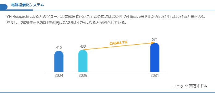 市場規模に関する整理では、電解塩素化システムの世界市場は2024年に415百万米ドルの規模にあり、2031年には571百万米ドルへと拡大する見込みで、2025年から2031年の期間における年平均成長率(CAGR)は4.7%に相当すると推計されています。こうした数値は、衛生・水処理ニーズの恒常的な拡大と、現場での安全性向上や物流リスク低減を目的としたオンサイト生成ソリューションの採用が進展していることを反映しています。特に、薬剤輸送やボンベ管理に伴う安全・規制対応の負荷を軽減したい公共・産業事業者にとって、現地で必要量を生成できる電解方式は運用面での魅力を持ちます。