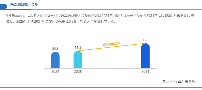 市場面の見通しについては、既存の市場推計を踏まえると、静電紡糸機ノズル市場は今後着実な拡大が期待されます。YH Researchが提示する推計値を要約すると、本市場は2024年時点でおよそ8,430万米ドルの規模が確認され、技術成熟と用途拡大が続く中で2031年には約1億2,800万米ドルに到達する見込みが示されています。このレンジ拡大を担う要因として、高性能フィルターや医療用途でのナノファイバー需要、フレキシブルエレクトロニクスや複合材料分野における機能性ナノファイバーの採用増加が挙げられます。提示された期間を年平均成長率で表現すると、2025年から2031年にかけて年率約6.2%で成長するという見通しが示されています。これらの数値は、試作・ニッチ高付加価値用途から徐々に用途領域が広がる過程を反映しています。