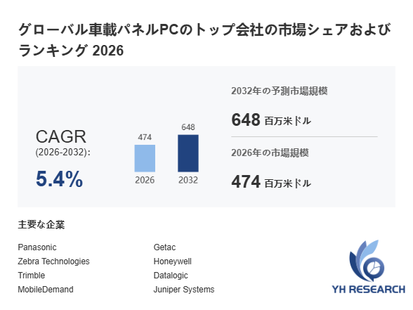 YHResearch調査チームの最新レポート「グローバル車載パネルPCのトップ会社の市場シェアおよびランキング 2026」によると、2026年の648百万米ドルから2032年には474百万米ドルに成長し、2026年から2032年の間にCAGRは5.4%になると予測されています。