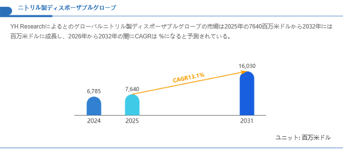 YHResearch調査チームの最新レポート「グローバルニトリル製ディスポーザブルグローブのトップ会社の市場シェアおよびランキング 2025」によると、2024年の6785百万米ドルから2031年には16030百万米ドルに成長し、2025年から2031年の間にCAGRは13.1%になると予測されています。このレポートはのグローバルニトリル製ディスポーザブルグローブの現状と今後の動向を調査および分析し、製品別、アプリケーション別、会社別、地域別と国別のニトリル製ディスポーザブルグローブの市場規模を把握するのに役立ちます。このレポートは、ニトリル製ディスポーザブルグローブの世界市場を詳細かつ総合的に分析し、2024年を基準年とした場合の市場規模および前年比成長率を掲載しています(単位:Kiloton & 百万米ドル)。